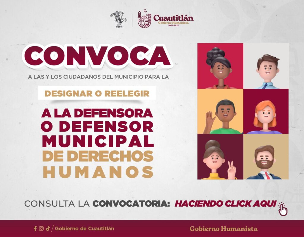 El Ayuntamiento de Cuautitlán 2025-2027, en cumplimiento con la normativa vigente y con el compromiso de garantizar la protección y promoción de los derechos humanos en el municipio, ha emitido la convocatoria para la designación o reelección de la Defensora o Defensor Municipal de Derechos Humanos.